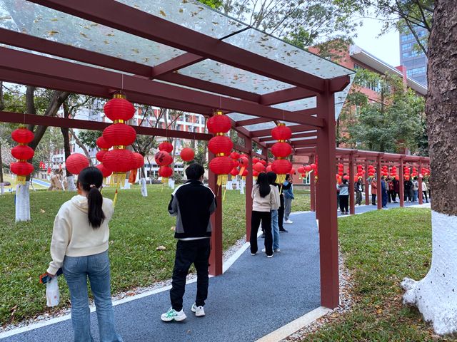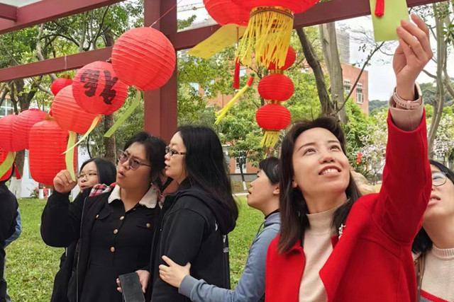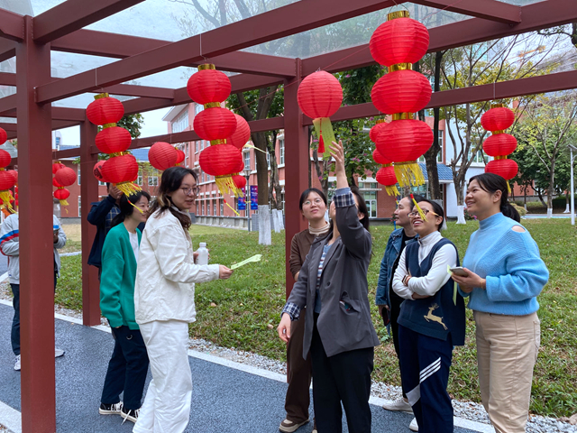 活動現(xiàn)場,各式燈籠裝飾點(diǎn)綴著整個花園長廊,滿是熱鬧喜慶的歡樂氛圍。燈籠下的謎底既貼近生活,又潛藏著民俗文化和歷史地理的知識,讓猜謎的過程趣味盎然、寓教于樂,參與的職工及學(xué)生或獨(dú)立思考,或發(fā)揚(yáng)團(tuán)隊(duì)合作精神,在展現(xiàn)各自才華的同時,領(lǐng)略了傳統(tǒng)文化的魅力和韻味。