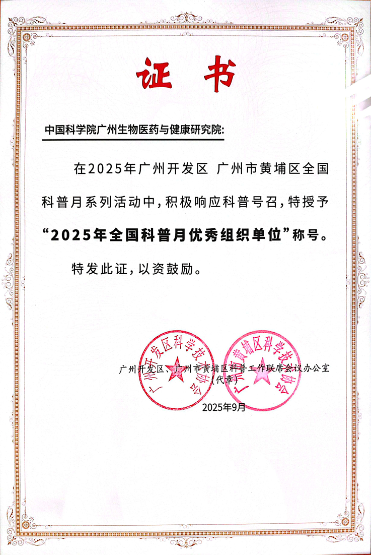 近日,中國科學院廣州生物醫(yī)藥與健康研究院(以下簡稱 “廣州健康院”)憑借在全國首個科普月期間的出色組織能力、豐富活動形式及顯著社會成效,獲得黃埔區(qū)授予的“2025年全國科普月優(yōu)秀組織單位”稱號。