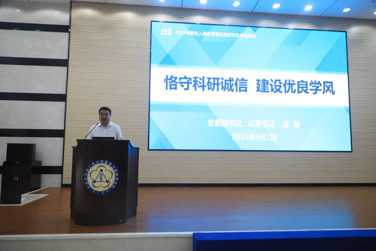 黨委副書(shū)記、紀(jì)委書(shū)記徐海作題為“恪守科研誠(chéng)信,建設(shè)優(yōu)良學(xué)風(fēng)”的專(zhuān)題黨課。他結(jié)合國(guó)家近年來(lái)關(guān)于科研誠(chéng)信建設(shè)的政策文件、中國(guó)科學(xué)院相關(guān)工作部署及廣州健康院內(nèi)部管理規(guī)定,系統(tǒng)解讀了科研誠(chéng)信的核心要求、具體標(biāo)準(zhǔn)與監(jiān)管措施,引導(dǎo)同學(xué)們積極弘揚(yáng)科學(xué)精神和工匠精神;通過(guò)深刻剖析典型警示案例,明確科研誠(chéng)信的底線與紅線,強(qiáng)調(diào)將“求真、務(wù)實(shí)、篤行”融入日常的科研學(xué)習(xí)中,樹(shù)立優(yōu)良學(xué)風(fēng)。