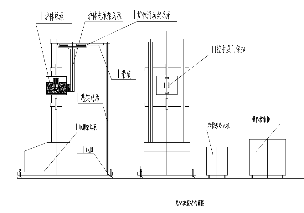 1)高溫爐體 為了讓用戶方便安全的更換試樣,采用水冷、可移動、對開式的爐體結構(具體見簡圖1).爐體及爐蓋采用雙層不銹鋼的焊接結構,總厚度約為15mm,中空通流動水。具有開門斷電功能。