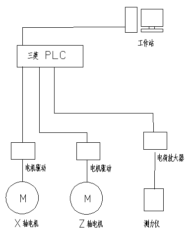 軟件系統(tǒng)由工作站、微型可編程控制器、電機(jī)驅(qū)動器、X軸電機(jī)、Z軸電機(jī)、實(shí)驗(yàn)室多通道電荷放大器、測力儀和專用軟件組成。