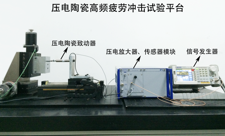 壓電陶瓷高頻疲勞沖擊試驗平臺(1 Hz < f ≤ 1 kHz),該試驗平臺包括:直線電機、Kistler 9203單通道測力儀、壓電陶瓷致動器、壓電放大器、傳感器模塊、信號發(fā)生器等設備。其驅(qū)動通過Renishaw光柵尺閉環(huán)系統(tǒng)控制,重復定位精度可達0.5μm,其Kistler單通道測力系統(tǒng)的采樣頻率可達27kHz。該試驗平臺可針對材料進行高頻疲勞沖擊試驗,從而研究其抗高頻疲勞性能。