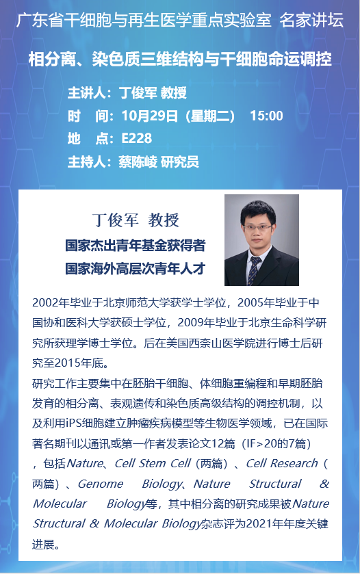 2024年10月29日廣東省干細(xì)胞與再生醫(yī)學(xué)重點(diǎn)實(shí)驗(yàn)室名家講壇:相分離、染色質(zhì)三維結(jié)構(gòu)與干細(xì)胞命運(yùn)調(diào)控