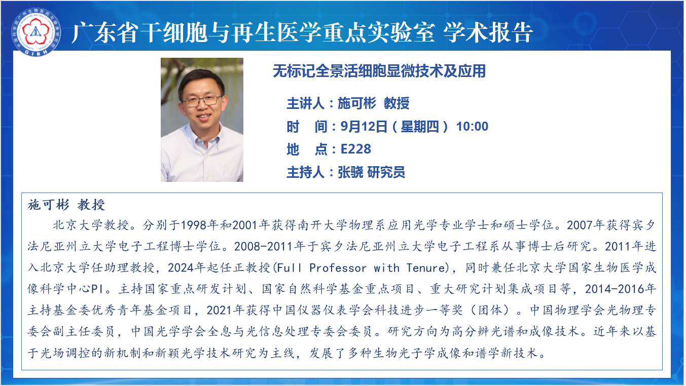 2024年9月12日廣東省干細胞與再生醫(yī)學(xué)重點實驗室學(xué)術(shù)報告:無標(biāo)記全景活細胞顯微技術(shù)及應(yīng)用